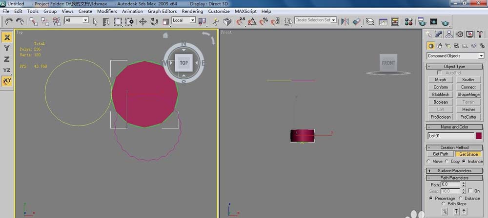 2、在前視圖中選擇直線,執(zhí)行【loft】(放樣)命令,在頂視圖中單擊圓,此時生成放樣物體。