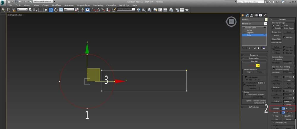 5、選中1號圓圈——點擊2號選項(相減)——點擊3號相交的二維線