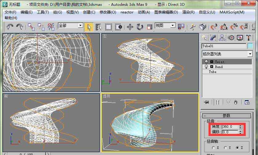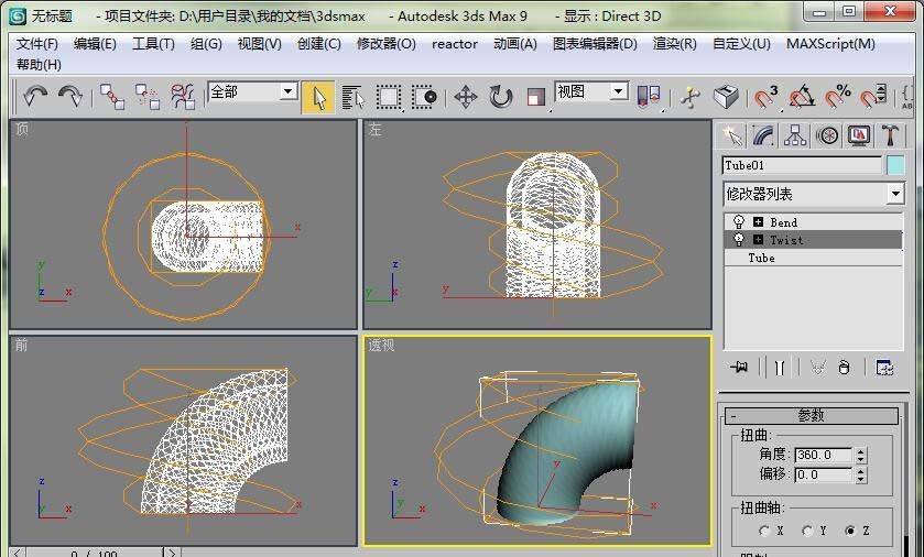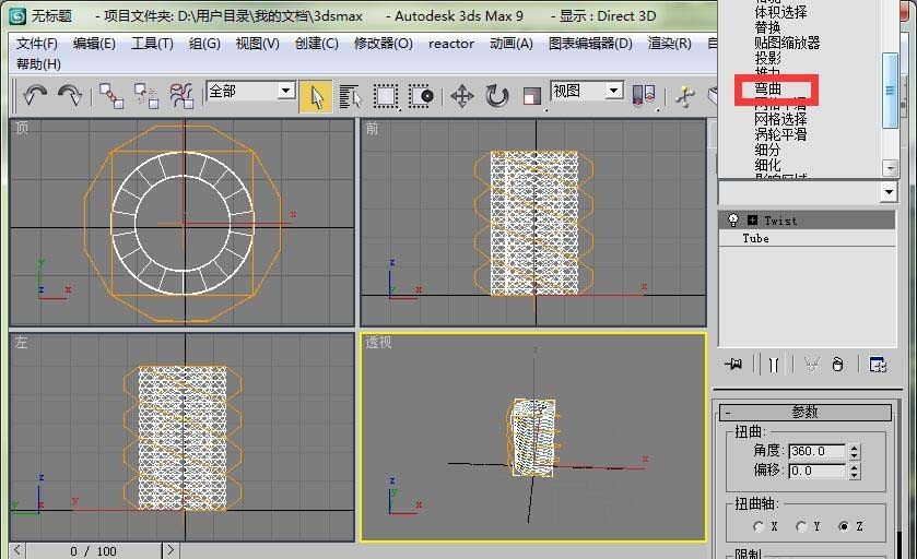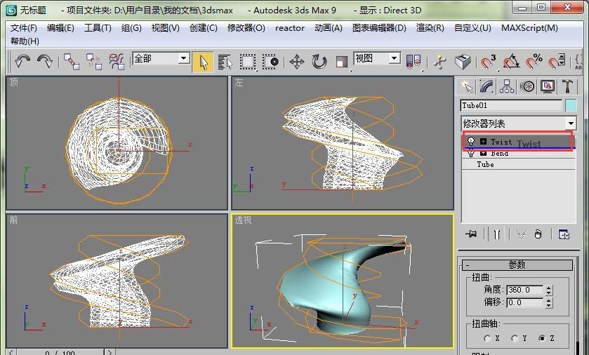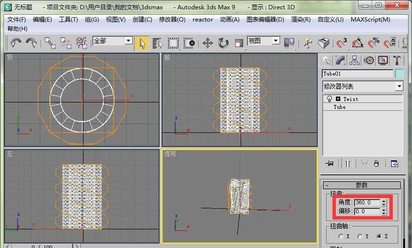 3、打開扭曲修改器卷展欄,設置扭曲角度為360度。這時管狀體已經發生了扭曲變形。