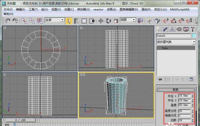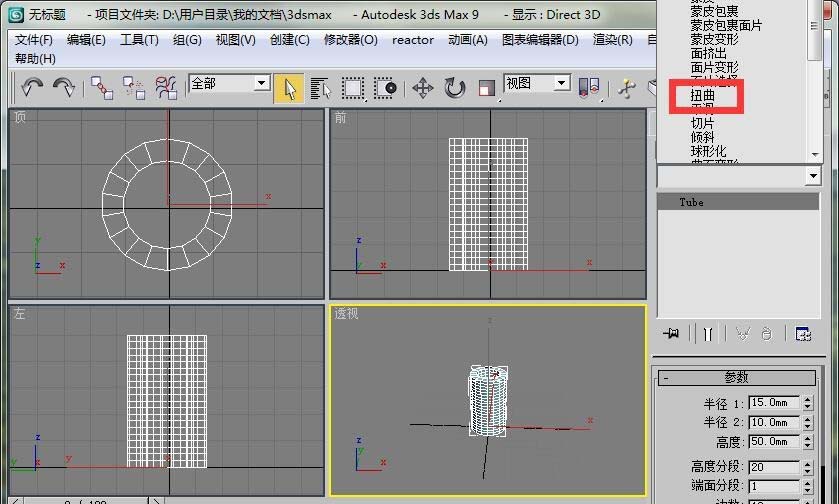 1、首先打開3dmax9,在標準基本體里選擇管狀體。畫一個半徑1為15mm,半徑2為10mm,高度為50mm的管狀體。高度分段為20.參數僅供參考。
