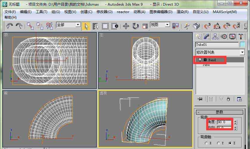 5、打開彎曲修改器卷展欄,設置彎曲角度為90度。這時管狀體發生了很自然的彎曲。