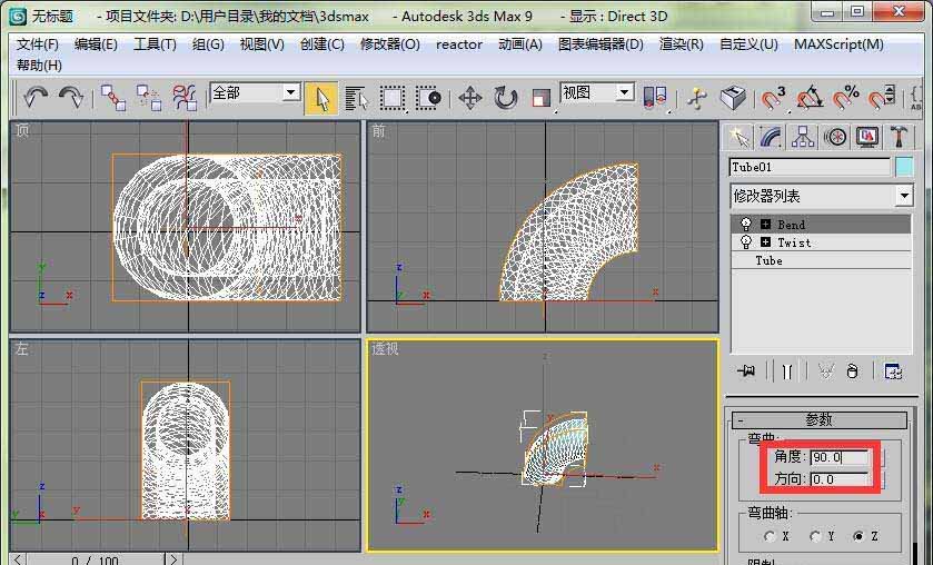 7、現在我們把修改器順序變一下。先添加彎曲修改器。設置彎曲角度為90度。能得到一個類似的效果,但是沒有扭曲效果。