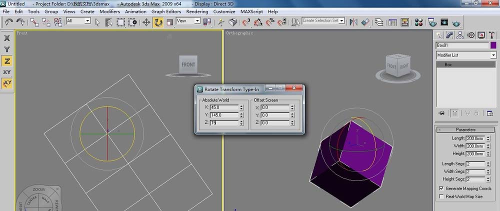 2、單擊(創建)/(幾何體)/【Box】(長方體)按鈕,在彈出的【Rotate Transform Type-In】(旋擇變換輸入)對話框中設置X、Y、Z的數值,得到的效果如圖所示。