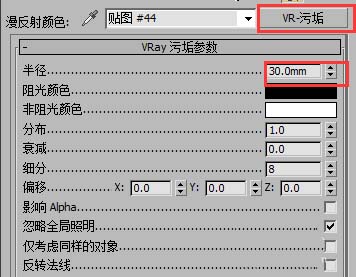 vr污垢貼圖的半徑默認是10,這里我先給30,進行測試。