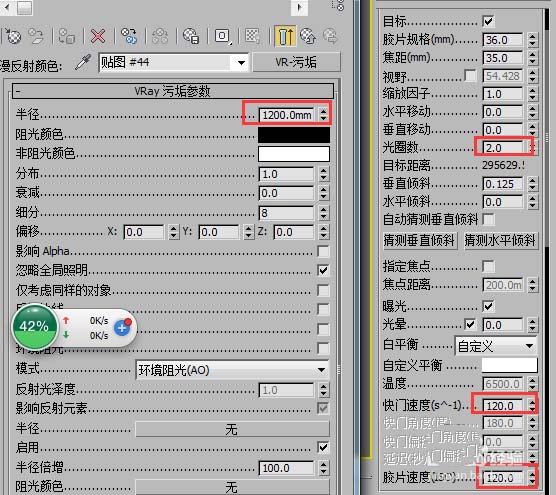現場AO圖非常的暗,這里經過我測試后的參數,vr污垢貼圖半徑加大到1200,vr攝像機參數光圈、快門速度、膠片速度等進行了修改。