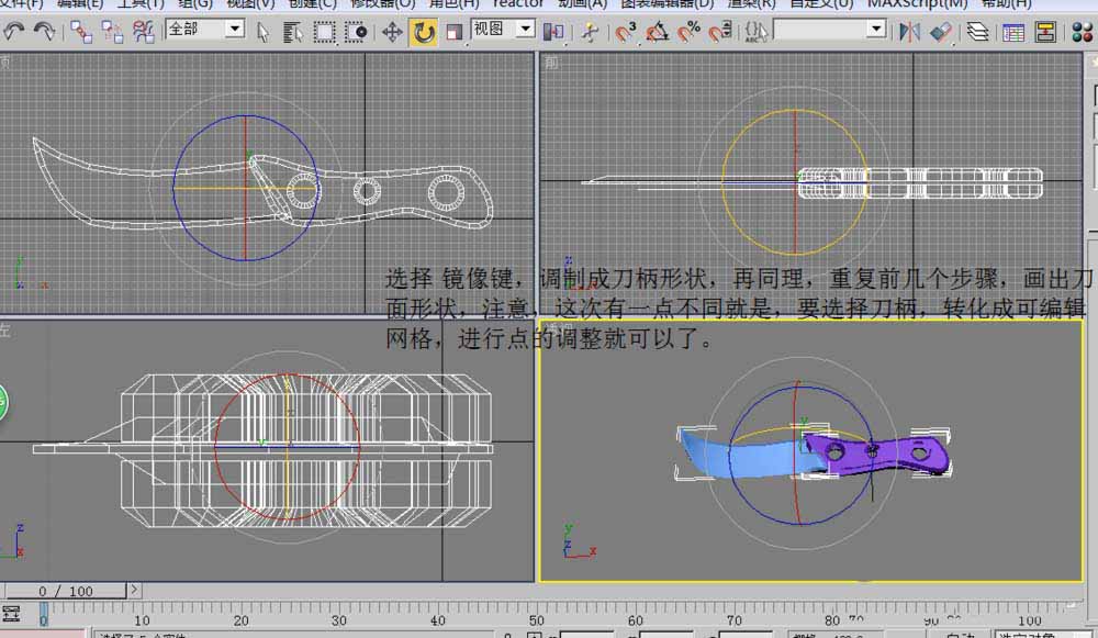 4、選擇鏡像鍵,調制成刀柄形狀,再同理,重復前幾個步驟,畫出刀面形狀,注意,這次有一點不同,就是要選擇刀柄,轉化成可客編輯網格,進行點的調整就可以了。