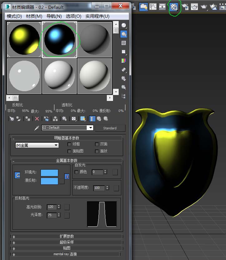 預覽物體材質:在材質編輯器里,點擊“在視口中顯示材質”按鈕或鼠標左鍵按住“在視口中顯示材質”按鈕不放,在彈出的選擇按鈕中選擇“顯示明暗對比材質”,也就是左邊邊那個按鈕。