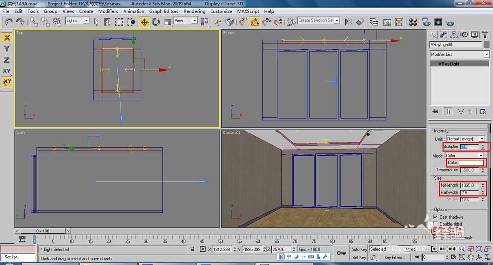 1、單擊(燈光)/【VRayLight】(燈光)按鈕,在前視圖燈槽窗的位置創(chuàng)建VR燈光,【Multiplier】(倍增器)設(shè)置為2.5左右,【Color】(顏色)設(shè)置為淡黃色,如下圖所示。
