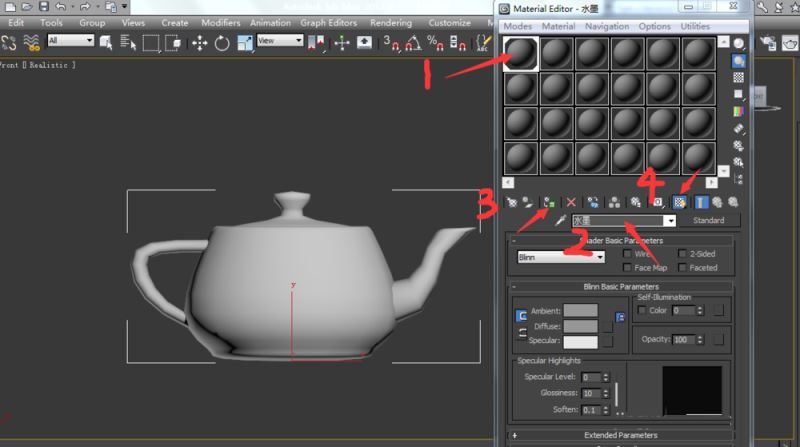 二:創(chuàng)建好茶壺后,選中茶壺,打開材質(zhì)編輯器(快捷鍵M鍵),將視窗切換為真實顯示的前視圖,命名一材質(zhì)球,將材質(zhì)賦予給場景中茶壺。操作是先點擊從左到右第三按鈕選項assign material to select,再點擊倒數(shù)第四個按鈕show shaded material viewport。