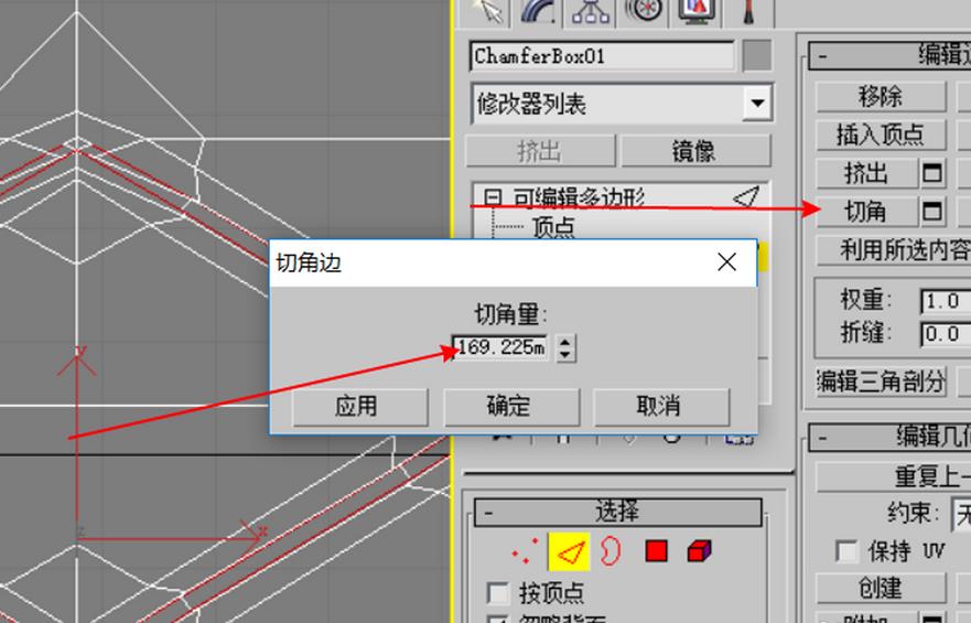 9、選擇切角命令,切角量要比上一步的擠出高度稍微小一些。