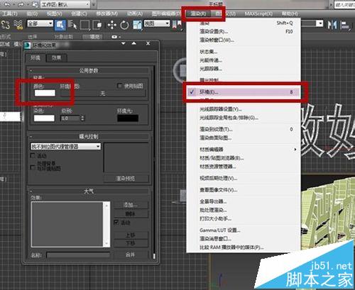 5、在菜單欄中選擇【渲染】-【環境】命令,或者直接按鍵盤上邊的8,打開【環境和效果】對話框,在環境中將背景選項中的【顏色】該為白色,如下圖所示。
