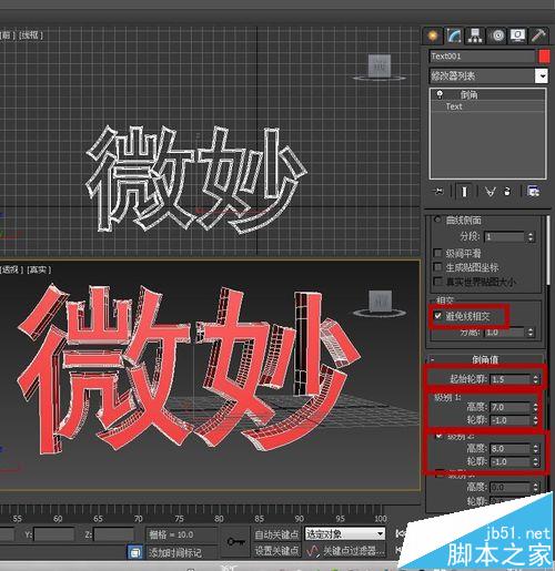 4、在【倒角值】的卷展欄中將【級別1】中的高度、輪廓分別設置為7.-1在【級別2】中的高度、輪廓分別設置為8.-1最后選中【避免線相交】復選框.
