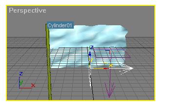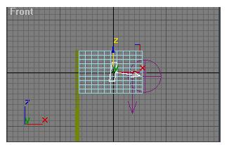1、創(chuàng)建旗幟模型。啟動3dmax4.0,單擊create/geometry鈕,單擊命令面板上的plane鈕,在front視圖中創(chuàng)建一個平面對象plane01作為紅旗,再單擊命令面板上的cylinder鈕,在top視圖中創(chuàng)建一個圓柱體cylinder01作為旗桿,然后調整它們的位置如下圖所示,旗桿的長度可根據(jù)需要自行調節(jié),完成后的場景如下圖所示: