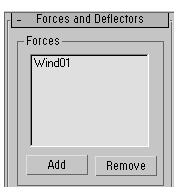 5、在命令面板的下方forces and deflectors選項的下面單擊add按鈕,然后在視圖中單擊我們創(chuàng)建的風力wind01,為紅旗加入風吹的效果,如下圖所示。這時我們可以單擊一下屏幕下方的播放動畫鈕,這時紅旗略微有一點點的飄動。