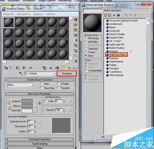 1、按M鍵,快速打開(kāi)【Material Editor】(材質(zhì)編輯器)窗口,激活第一個(gè)材質(zhì)球,單擊【Standard】(標(biāo)準(zhǔn))按鈕,在彈出的【Material/Map Browser】(材質(zhì)/貼圖瀏覽器)對(duì)話框中選擇【Multi/Sub-Object】(多維/子對(duì)象)材質(zhì),最后單擊【OK】按鈕,如下圖。