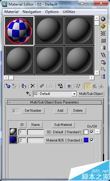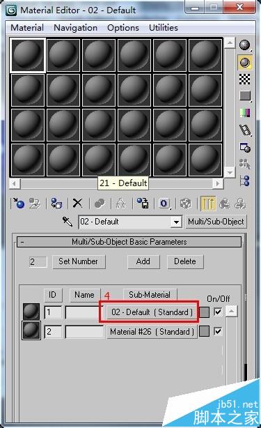 2、此時(shí)的面板就是【Multi/Sub-Object】(多維/子對(duì)象)材質(zhì)了,默認(rèn)是10種材質(zhì),單擊【Set Number】(設(shè)置數(shù)目)按鈕,在彈出的【Set Mumber of Materials】(設(shè)置材質(zhì)數(shù)量)對(duì)話框中設(shè)置樹(shù)目為2,單擊【OK】,在單擊【01-Default (Standard)】按鈕,在標(biāo)準(zhǔn)材質(zhì)界面中設(shè)置顏色為白色,如下圖所示。