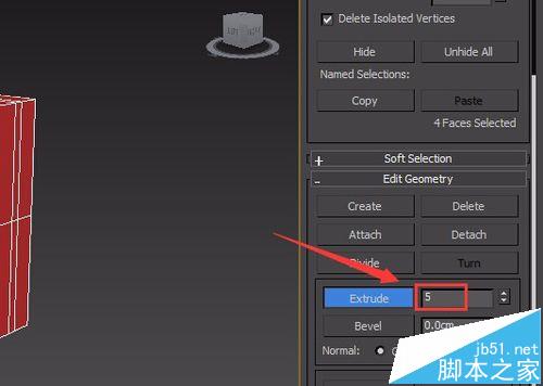 5、按下鍵盤上的數字4鍵進入多邊形層級,在透視圖里選擇兩個側面,找到下面的extrude選項,設置其值為5,如圖所示: