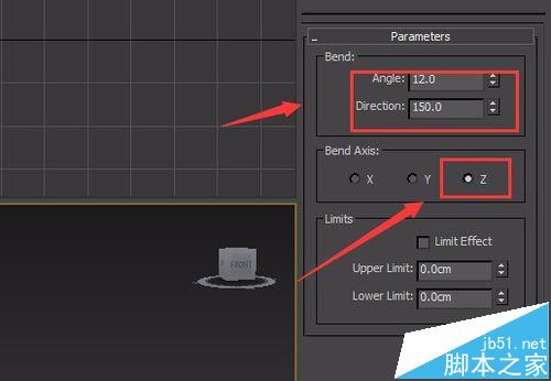 12、選擇制作好的腿,給其添加一個bend修改器,并設置其參數如圖所示: