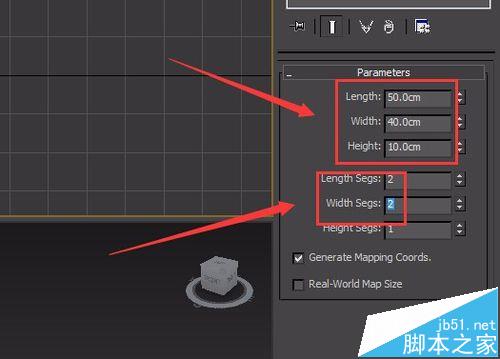 3、點擊box命令,在前視圖繪制一個box物體,并在modify下修改器參數,如圖所示: