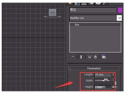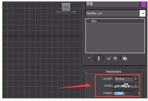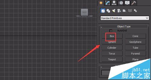 7、再次在geography里找到box命令,并調節其大小,在前視圖創建一個box作為開關,如圖所示: