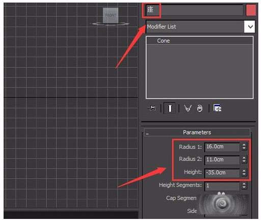 4、選擇創(chuàng)建的cone物體,在modify里修改名字為座,并調(diào)節(jié)其參數(shù)如圖: