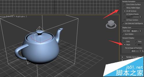 4、我們簡單看下一些重要的參數,其他的自己掌握,首先讓他發射所有的點上面,其次就是以網格的物體顯示,