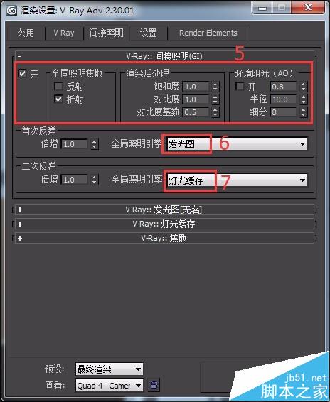 4、下面,間接照明——打開間接照明——在一次反彈里面選擇“發(fā)光圖”——在二次反彈里面選擇“燈光緩存”。