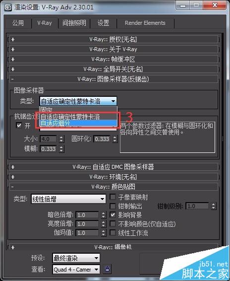 3、再然后,圖像采樣器——類型——自適應(yīng)確定性蒙特卡洛、自適應(yīng)細(xì)分(這兩個(gè)都可以選擇哦),顏色貼圖——類型——線性倍增,打開抗鋸齒過濾,如下圖