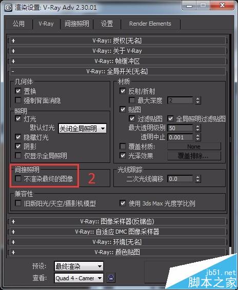 2、然后,vray——全局開關(guān)——關(guān)閉全局照明 ,不渲染最終的圖像 不打勾,如下圖