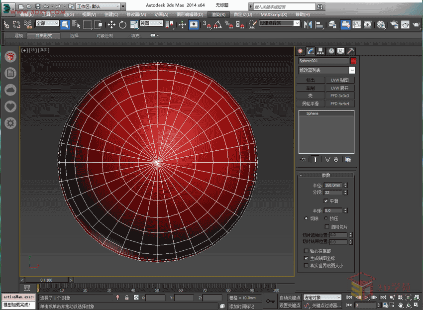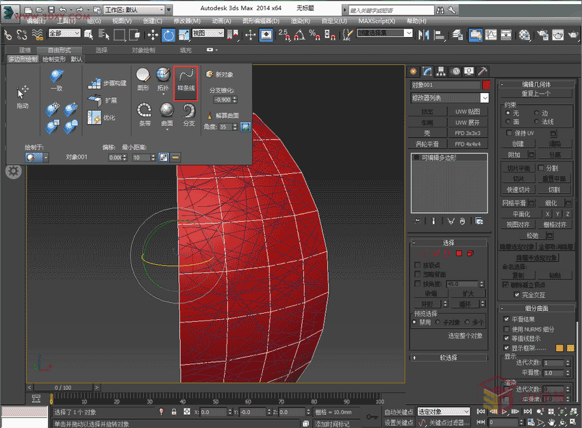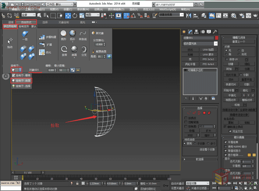 3,刪除其他部分,打開石墨工具-自由變形-多邊形繪制-繪制于-繪制于曲面,拾取球面,石墨工具上會顯示拾取了對象001。
