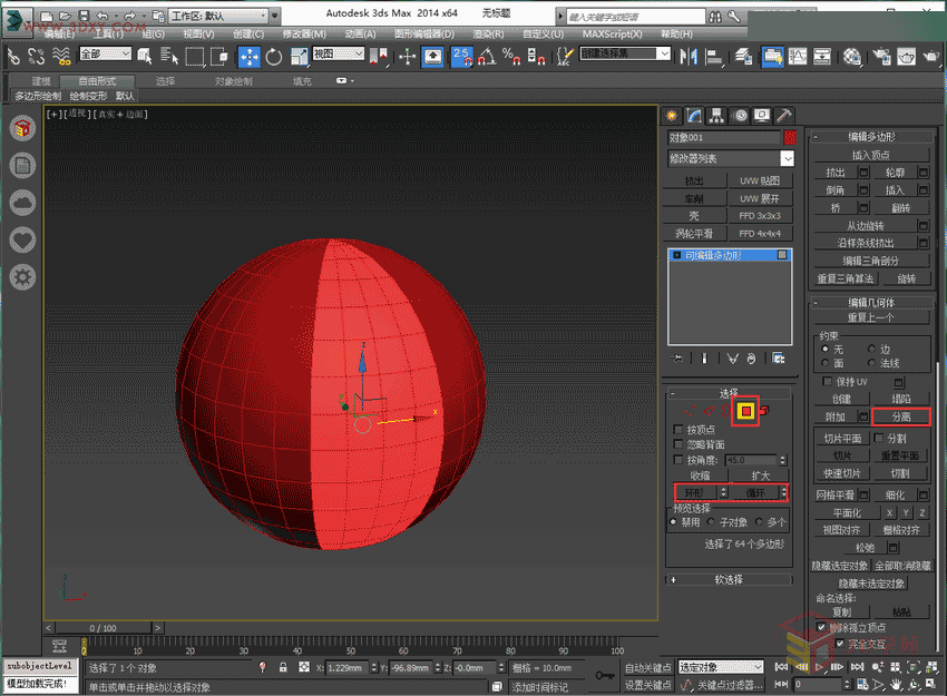 2,將球體轉換成可編輯多邊形,進入面層級,利用環形、循環命令選中八分之一個球面,并將其分離出來。