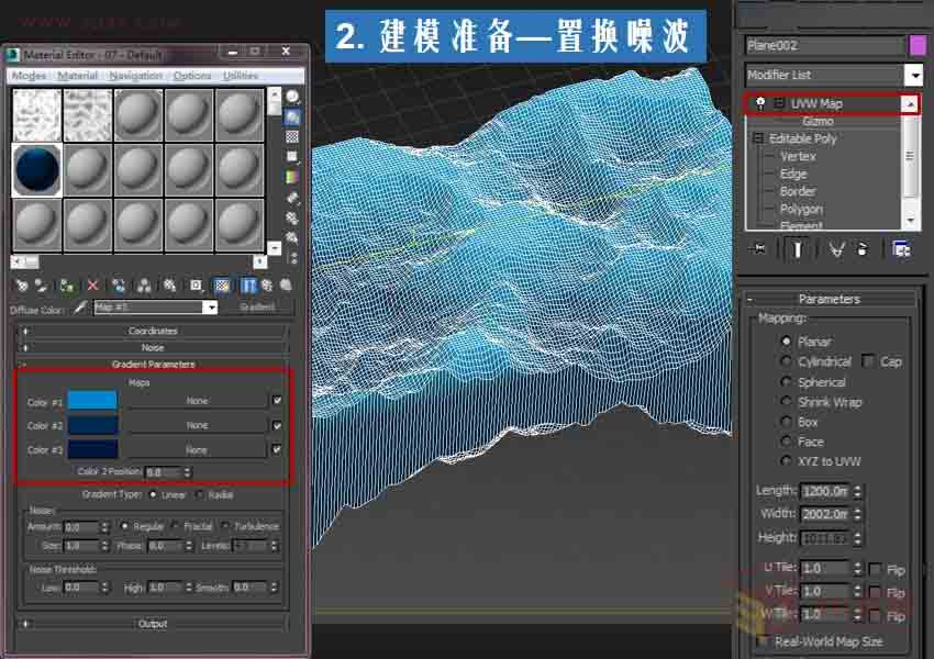 添加貼圖坐標修改器,注意漸變海洋藍色。