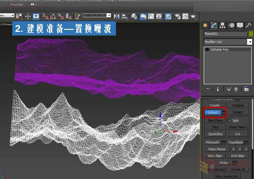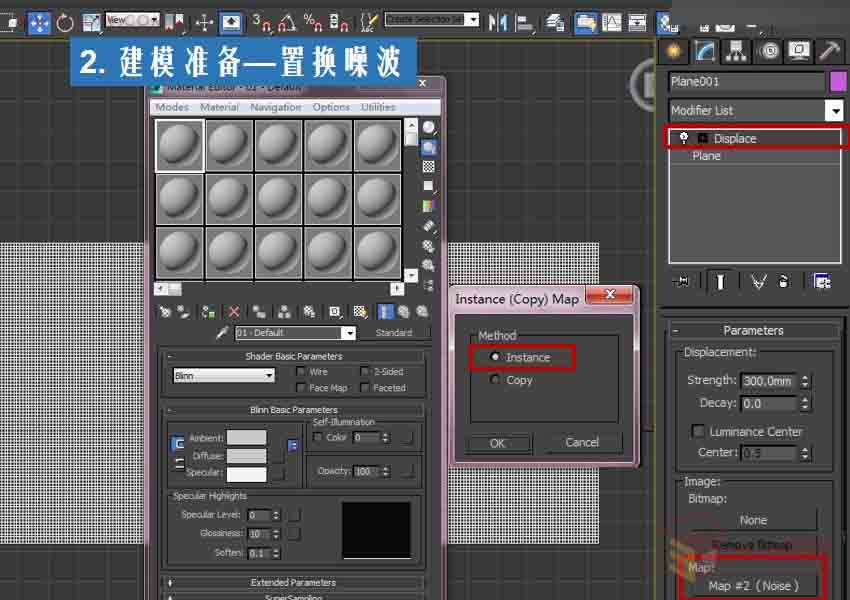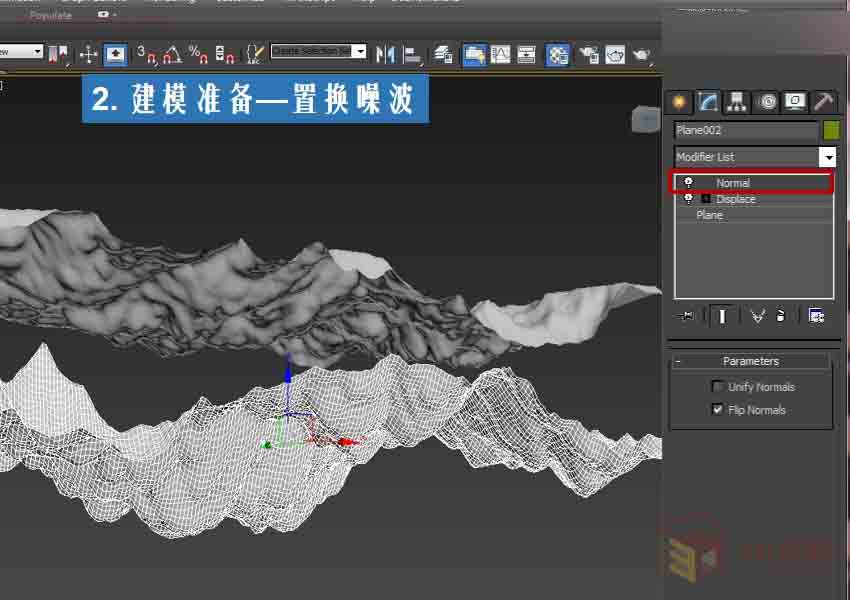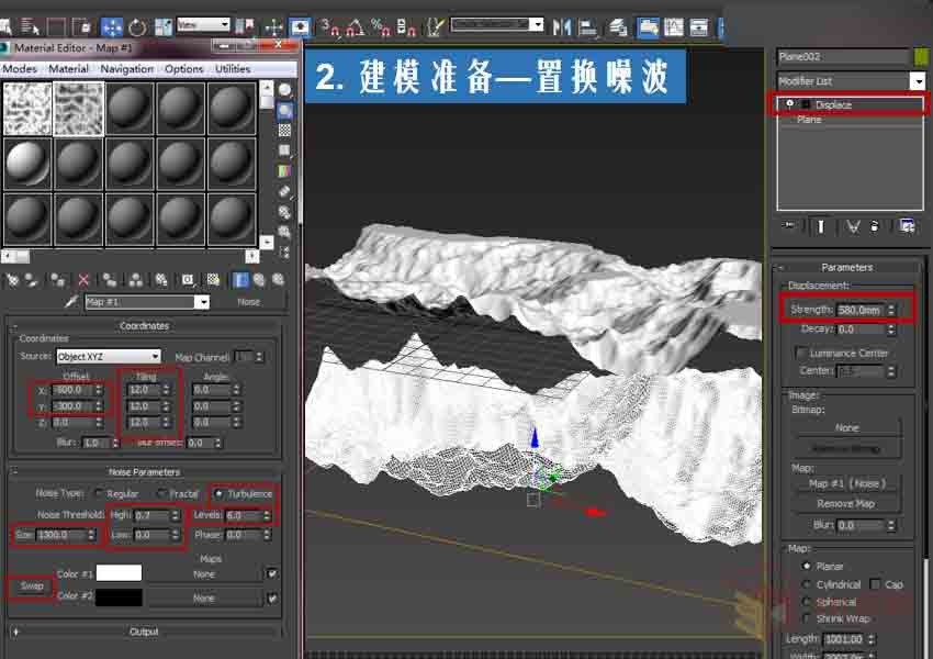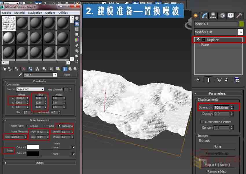 第二步:添加置換修改器(Displace)。然后在貼圖上添加噪波(Noise)程序貼圖。