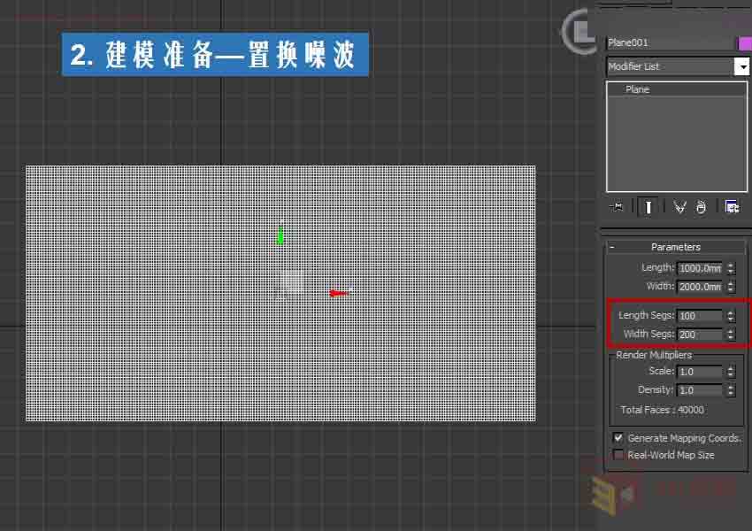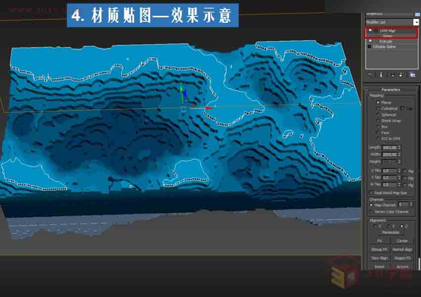 第十三步:擠出完成后,我們在頂視圖將上面的海洋地形部分賦予我們之前的漸變材質,添加貼圖坐標修改器。