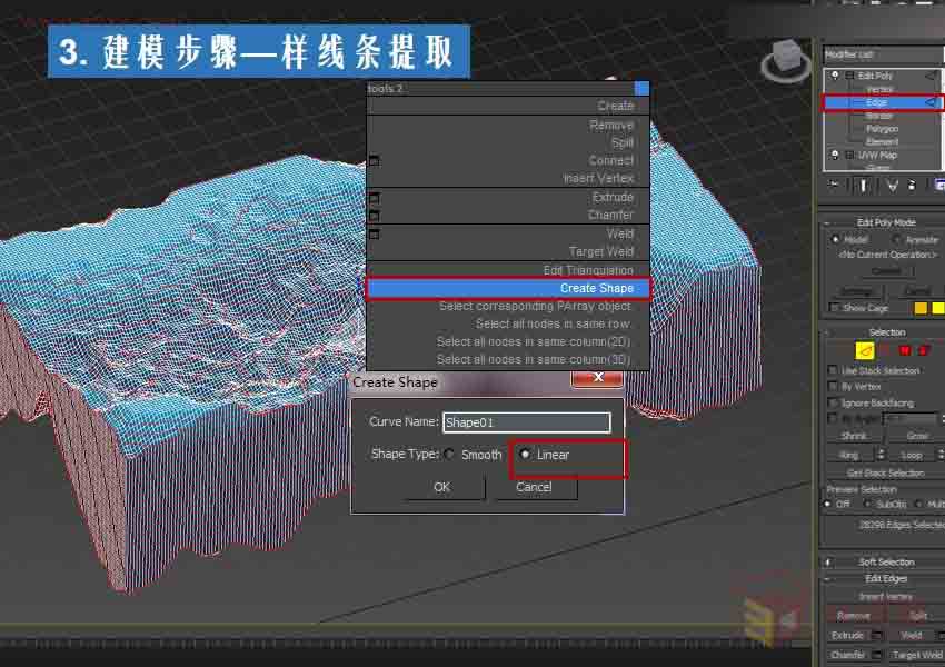 第十步:當你依次切割完成后,進入線層級你會發現,剛才切的線處于選中狀態。這樣你可以直接提線(Creat Shape),注意看提取線類型。