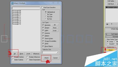 4、選取窗子右移動(dòng)0.6m,上移0.9m,右鍵Hide Unselected隱藏其它,點(diǎn)選第一個(gè)窗子如圖,后 進(jìn)入修改欄點(diǎn)擊【Attach】接著點(diǎn)擊【Attach Mult】,出現(xiàn)對(duì)話框,依次點(diǎn)擊