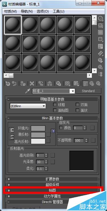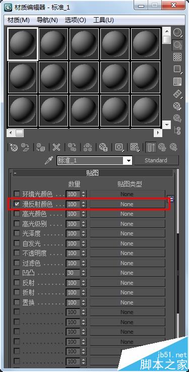3、如圖,使用快捷鍵“M”,打開“材質(zhì)編輯器”,選中第一顆材質(zhì)球