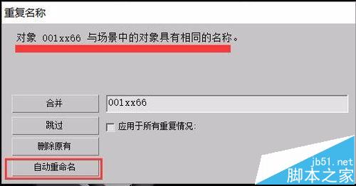 5、有時候會出現(xiàn)名字一樣的模型,那就讓系統(tǒng)為您自動重命名,點(diǎn)自動重命名。或者自己輸入名字,點(diǎn)擊合并