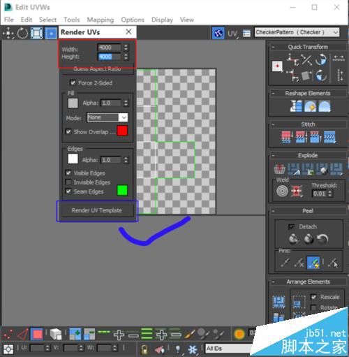 14、在這個菜單里,如圖所示紅色框選的兩個數值原始數據是“1024”,指的是圖像精細程度,我們盡量改大一點,在這里我改成“4000”;然后點擊藍色框選的按鈕,輸出UV