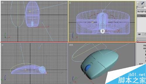 6、選擇放樣模型,在“幾何體”面板中的下拉列表框中選擇“復合對象”選項,然后單擊“布爾”按鈕,進行布爾運算,產生鼠標凹槽。 單擊“標準基本體”面板中的“圓環”按鈕,在左視圖中創建一個圓環作為滾輪,并修改相關的屬性參數。 單擊“圖形”面板中的“線”按鈕,在頂視圖中創建一條曲線。再利用“圖形”面板中的“圓”工具在前視圖中創建一個圓形。 選擇繪制的曲線,然后在“幾何體”面板中的下拉列表框中選擇“復合對象”,并單擊其中的“放樣”按鈕,實現放樣操作,此時放樣操作拾取的截面為前視圖中的圓形。 單擊“標準基本體”面板中的“圓環”按鈕,在頂視圖中創建一個小的圓環作為鼠標線的裝飾物,如圖所示。