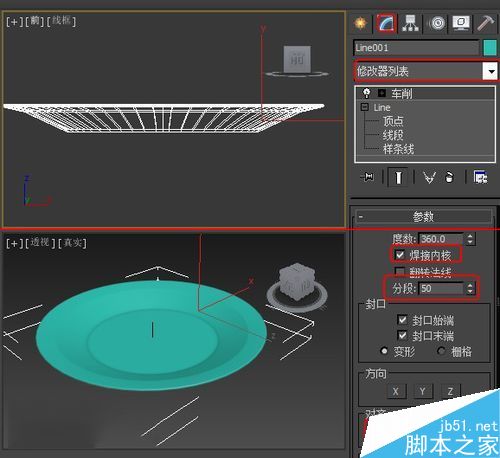 4、在“修改器列表”下拉菜單中選擇“車削”命令,在“參數(shù)”卷展欄中勾選“焊接內(nèi)核”復(fù)選框,將“分段”設(shè)置為50,讓盤子更圓滑一些,并單擊“對齊”選區(qū)中的“最小”按鈕,如圖所示。