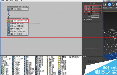4、在"事件001"中創(chuàng)建出生事件,并調(diào)整發(fā)生開始為負(fù)數(shù),(因為只是渲染靜幀,所以讓雨水在第0幀時就落下來)增加粒子數(shù)量.