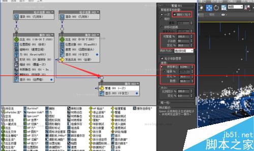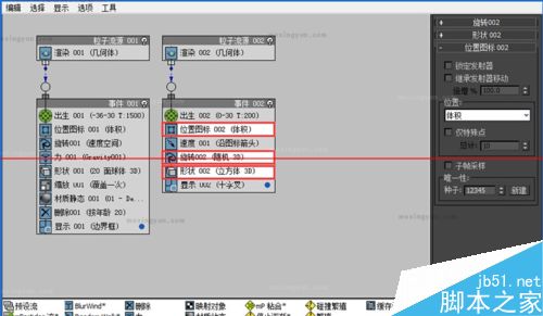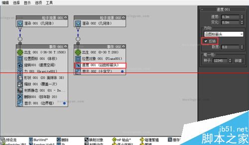 18、將"事件002"中的發(fā)送,連接至"事件003"(使事件2中的粒子得到復(fù)制),并修改繁殖屬性,加大繁殖數(shù)量(子孫數(shù))和"變化%",速度里的散度可以控制粒子的散開大小,以此模擬水花的飛濺.