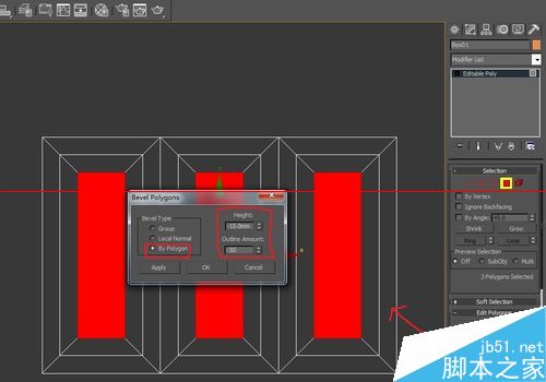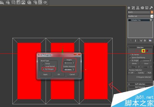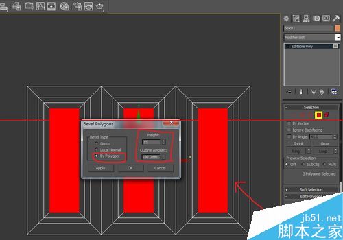 第七步,再次單擊右下方界面Bevel按鈕,在新彈出的界面上,左側選擇By polygon,右側輸入Height數值:-15(這個數值代表柜門槽子的深度是1.5厘米,此數值可以根據需要變化),Outline Amount:-30(這個數值也可以根據需要變化,此數值代表造型槽的寬度為3厘米)。