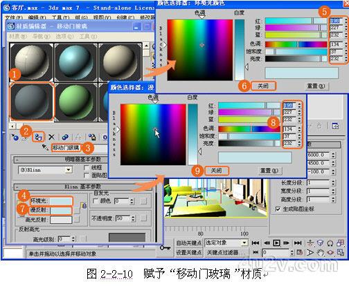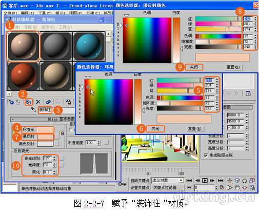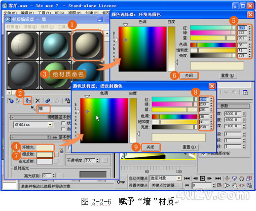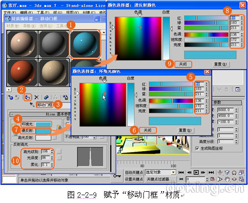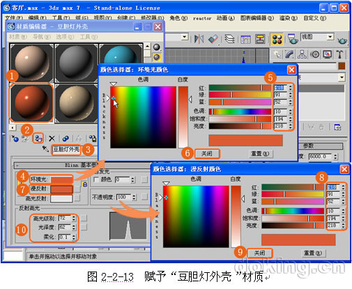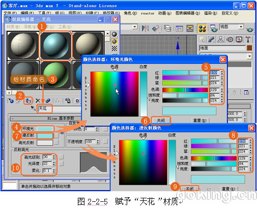 設置它的漫反射色和環境色,具體操作步驟與參數設置如圖2-2-7所示。