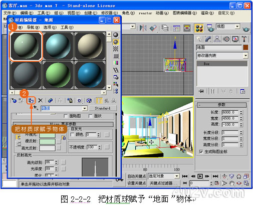單擊工具欄中的【材質編輯器】圖標打開【材質編輯器】對話框,選擇第一個缺省材質球,并把材質球賦予物體,如圖2-2-2所示。