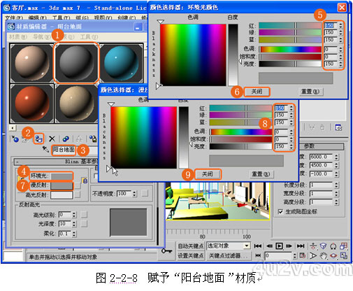 設置它的漫反射色和環境色,具體操作步驟與參數設置如圖2-2-8所示。
