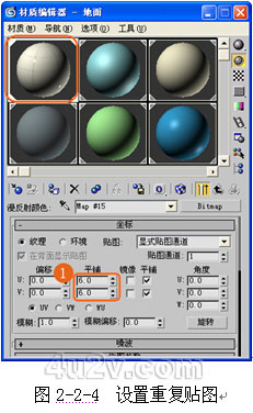 在其【坐標】卷展欄中設置【平鋪】值為(u)6,垂直【平鋪】貼圖值為6,如圖2-2-4所示。