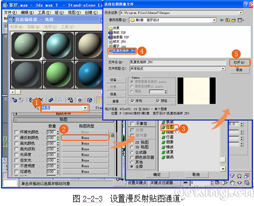 在【blinn基本參數】卷展欄中單擊【漫反射顏色】右邊的,進入【材質|貼圖、瀏覽器】對話框,然后在【位圖】上雙擊鼠標左鍵,在彈出的對話框中選取配套光盤中的【素材】|【第2章客廳設計】|【乳黃色地磚.jpg】作為位圖貼圖,如圖2-2-3所示。