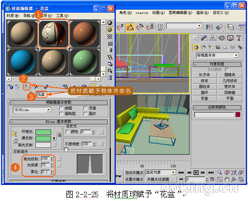 選擇一個缺省的材質球,將其賦予"花盆"物體并命名為"花盆",如圖2-2-25所示。
